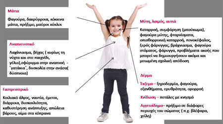 Αν το παιδί σας έχει κάποια από τα συμπτώματα που εμφανίζονται στην παραπάνω εικόνα, τότε υπάρχει υποψία αλλεργικής νόσου.